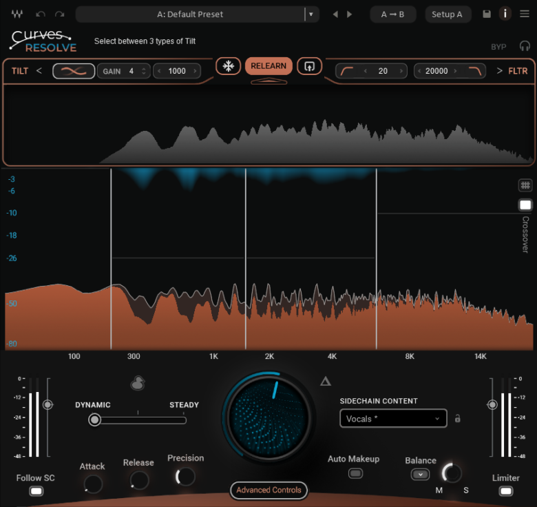 Curves Resolveは、ミックス内の複数のトラック間の不一致をインテリジェントに解決します。1つのトラックを別のトラックに聴き取り、衝突が発生した箇所のみにスペースを確保します。