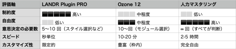 LANDR・Ozone12・人力マスタリングはグラデーションの関係になっています。