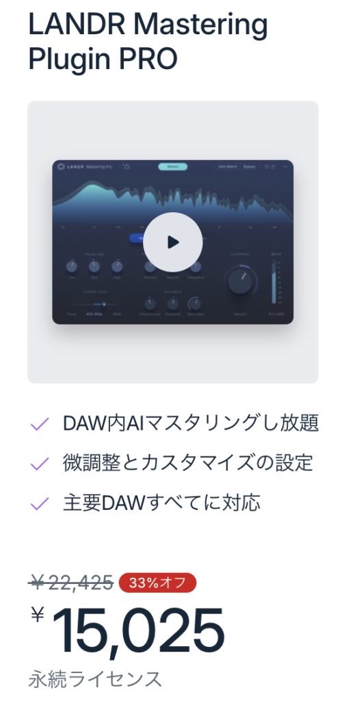 LANDR Mastering Plugin PROも買い切りはありますが結構いい値段します。