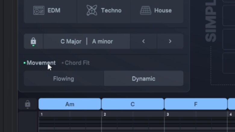 個人的には生成メロディをメインとして使う場合は、Movementはdynamic、Chord FitはRelaxedがおすすめです。