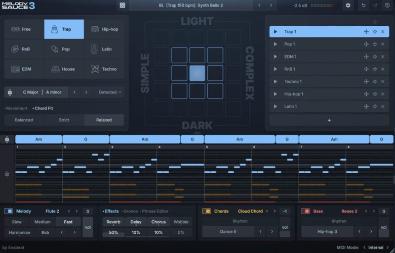 以前はメロディ中心だったが今作ではコードやベースラインも生成できるようになり、さらなる作曲補助ツールとして活躍の幅を広げてきた印象です。