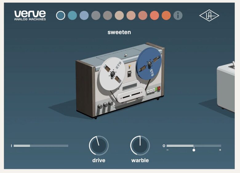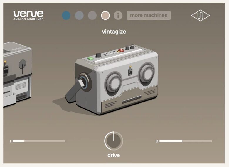 Verve Analog Machines Essentialsは「4つのアナログテープマシン」を1つのプラグインに統合しました。各機種のユニークなサチュレーション特性を「ワンノブ」シンプル操作で切り替えられます。