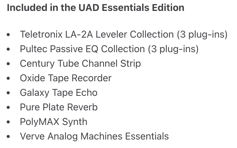 実は今回の無償配布は、「UAD Essentials Edition」とほぼ同じような内容となっています。